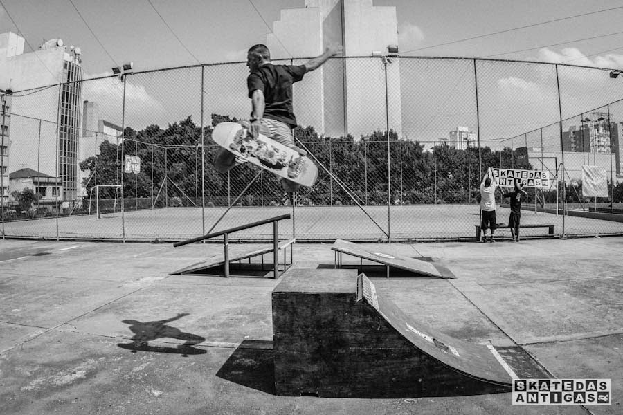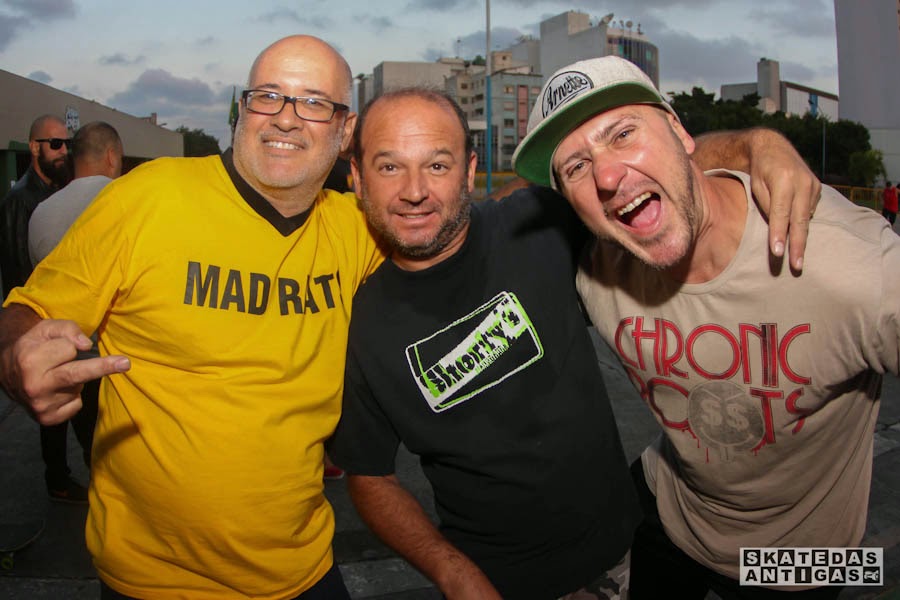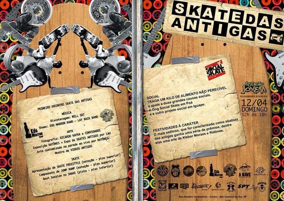 “Aconteceu no último domingo (12.04) o PRIMEIRO ENCONTRO SKATE DAS ANTIGAS, um evento totalmente “for fun”, com o objetivo de resgatar aquela diversão sem muita pretensão, uma paixão inexplicável que só quem é skatista de alma sabe o que é. Em um trabalho cooperativo, skatistas de diversas áreas se reuniram para proporcionar um grande encontro na cidade de São Caetano do Sul. A discotecagem rolou através das pick ups do Will Skt apresentando sons antigos que navegavam no RAP e no ROCK e juntamente com os shows de Edu Marron Band e Lay Back Band foram a trilha sonora dos skatistas das antigas, que se dividiam entre as rampas de varar, o skate freestyle e a session no snake na parte inferior do complexo da Estação Jovem. Muitos skatistas compareceram com suas famílias e aqueles que não estavam em alguma das sessões que rolavam, puderam além de curtir o som e os videos antigos de skate, conferir as exposições de shapes customizados e corporativos de Ratónes, de estrelas do rock internacional produzida por Edu Marron e os skates antigos da década de 80 do acervo do Lau. Skatistas de várias épocas e modalidades compareceram ao evento, algumas personalidades, profissionais do passado, amigos de antigamente, pessoas com muitas histórias e lembranças do skate para contar. Um dia inesquecível que vai ficar na memória de quem esteve presente.”